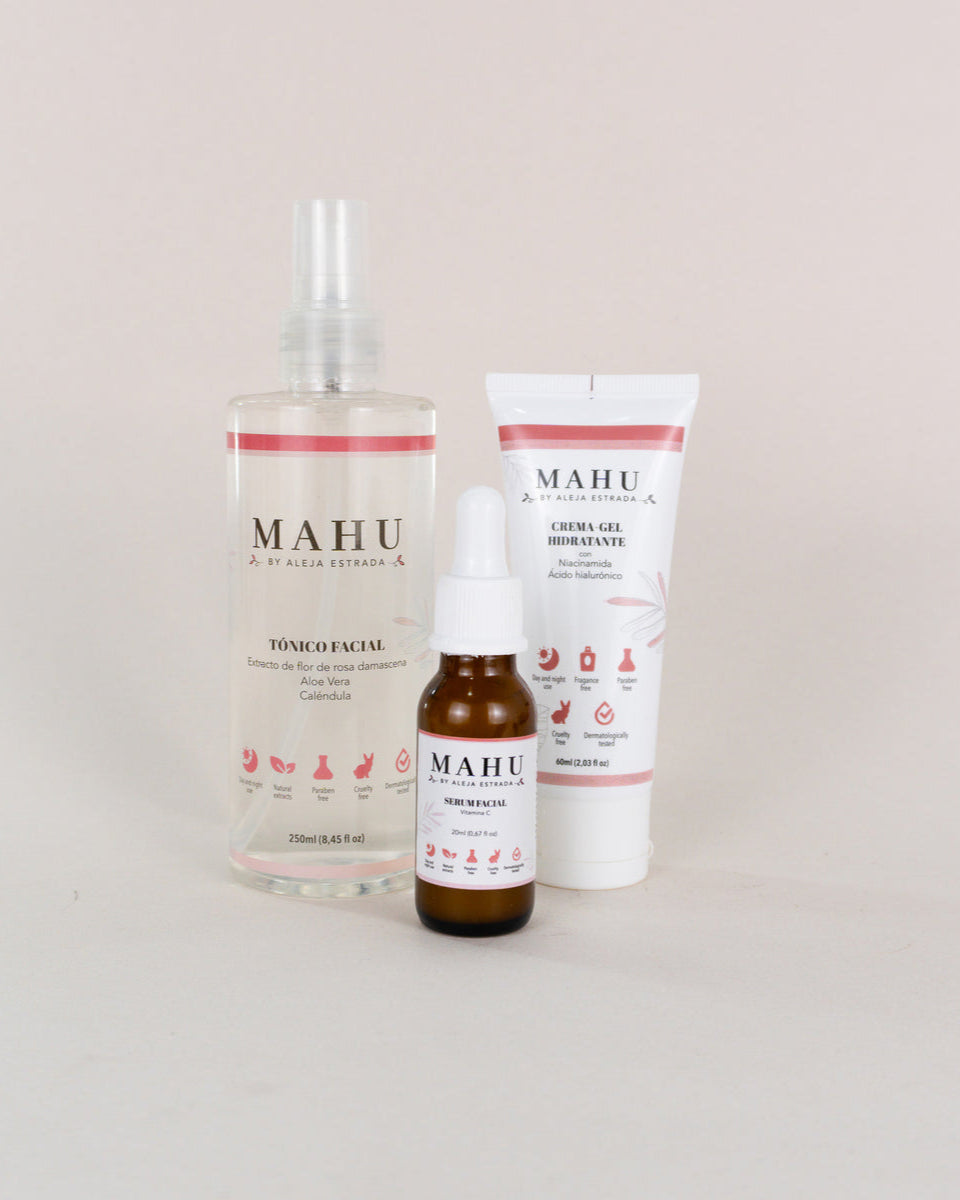 Kit Hidratación MAHU By Aleja Estrada. Este set incluye tres productos fundamentales que trabajan en sinergia para limpiar, tonificar e hidratar tu rostro, proporcionando una base perfecta para tu rutina diaria de cuidado facial.