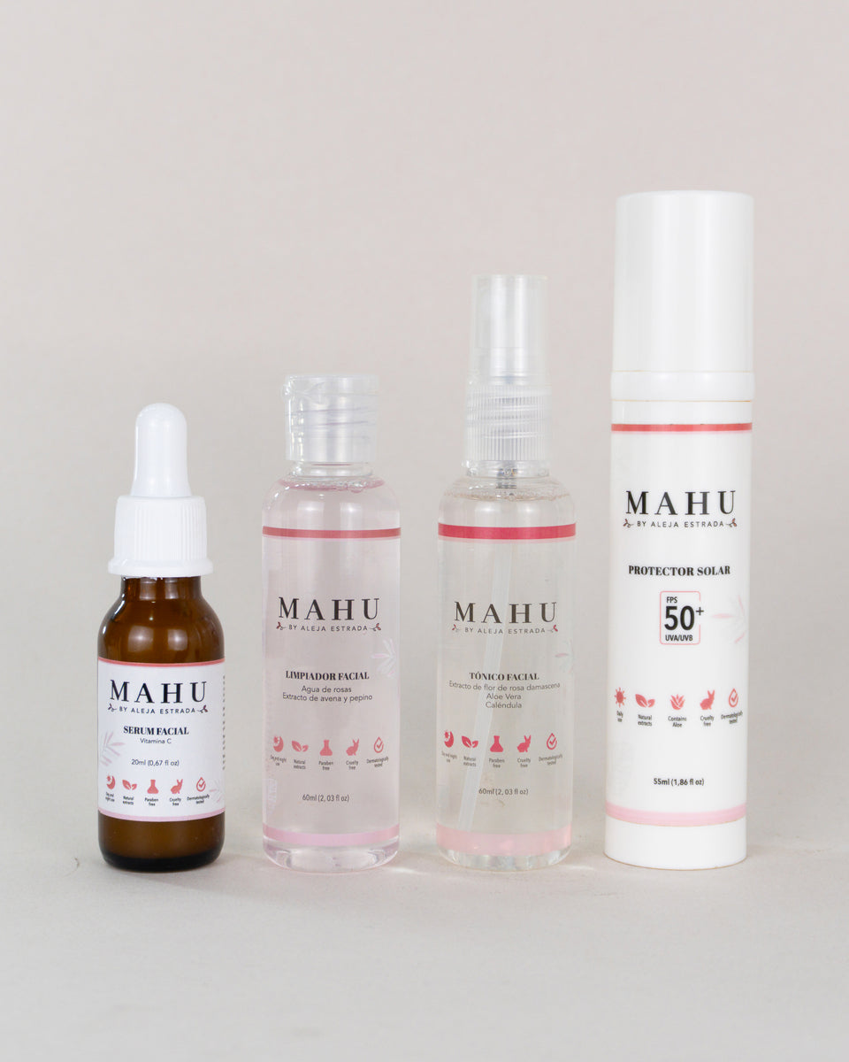 Kit Playa MAHU By Aleja Estrada, este set compacto incluye cuatro productos esenciales que trabajan en sinergia para limpiar, tonificar, hidratar y proteger tu rostro durante tus actividades al aire libre.