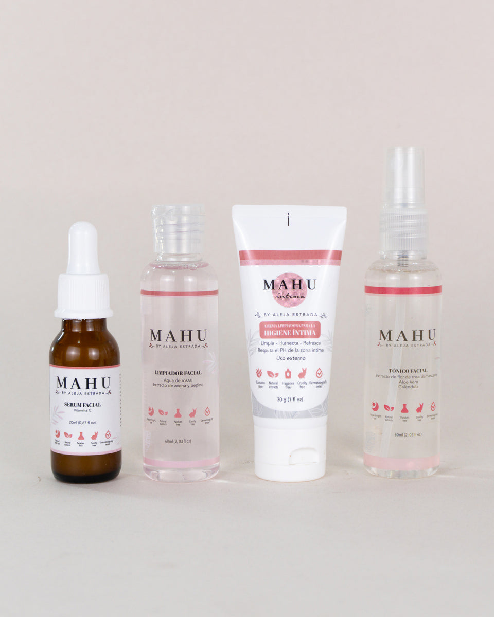 Kit Viajero íntimo MAHU By Aleja Estrada, este set compacto incluye cuatro productos esenciales en tamaño mini, ideales para llevar en tu equipaje de mano o para probar la eficacia de nuestra línea de cuidado de la piel y cuidado íntimo.